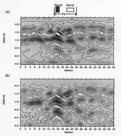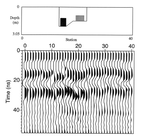 Figure 3 shows the raw data record for profile line 24 located directly over the standing metal and horizontal plastic barrels. The raw record is displayed in a format called a shaded wiggle trace plot. The horizontal axis is the position of the midpoint between the Tx and Rx and the vertical axis is time. Since more time is required for the transmitter wave to travel deeper and be reflected back to the surface, the time axis is proportional to depth. The amplitude of the response is represented by a wiggle trace when positive responses are shaded in black. The scattering response from the metal barrel is apparent by the hyperbolic curve with its peak located at station 16 and 28 nanoseconds. It is difficult to see any scattering response from the plastic barrel.