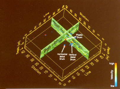 In most cases, the geophysicist looks at the reflection and scatter pattern from the buried objects and tries to determine what objects caused the response. As part of my Master's thesis, I wrote a computer imaging algorithm to processed the reflected and scattered energy and create an image of the object that caused the response. The algorithm solves for any objects in the earth and records them as velocity values. Good conductors have low velocity values and resistors have high velocity values. I wrote the algorithm to process data in two dimensions (if just a line of data were collected) and in three dimensions (if a grid of data were collected). The intent of the algorithm was to make the interpretation of the data much easier for the geophysicist.