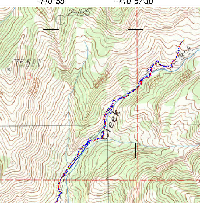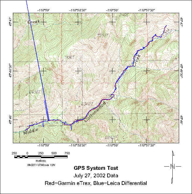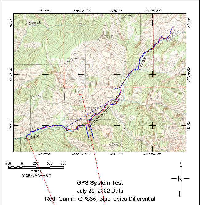 Figure 3 shows the path I walked while I was wearing the GPS-35 (red) and Leica differential unit (blue) on my backpack. Both GPS antennas were mounted at the same height and only several centimeters apart. The path length is approximately 8.0 km (4 km up the trail and 4 km return distance). The contour interval on the topographic map is 40 feet. The trail follows Middle Cottonwood Creek up a relatively steep canyon with significant timber and brush in the bottom. There were isolated errors of the GPS-35 but in general the path up the trail is very close to the path down the trail. The Leica performed more poorly. There are numerous significant errors of position and for one extended length near the middle of the trail, the receiver completely lost contact with the satellites (exhibited by the straight blue line).
