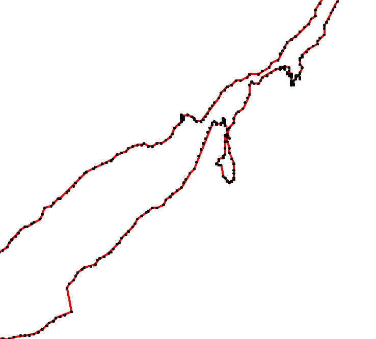 Figure 6 shows one of the worst errors of position for the GPS-35 unit in a close up of the upper part of the trail. The path is indicated by the red line and individual one second stations are shown by the black dots. For scale, the largest deviation between the path walking up and down the trail is 24 meters. While viewing the error information provided by the GPS (PDOP and estimated error values) is useful, it is also good to look at the path itself. Note the sudden jog in position in the southeastern part of the figure. Also note the loop that is shown in the trail. These are both solid indications the GPS is having trouble finding the position. Another good indicator of poor positioning is given by numerous closely spaced and then several widely spaced positions. This data segment would be a strong candidate for resurvey in a production survey.