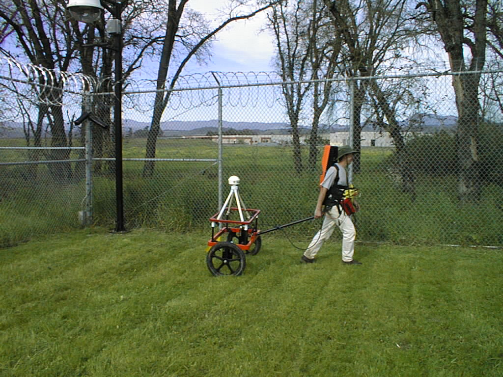 Here I am using an EM-61 metal detector to survey for UXOs (UneXploded Ordinance) inside of the Sonoma County Penitentiary in Santa Rosa, California. Position information is obtained using a Trimble GPS receiver. This is the most unusual survey I have performed in my career.