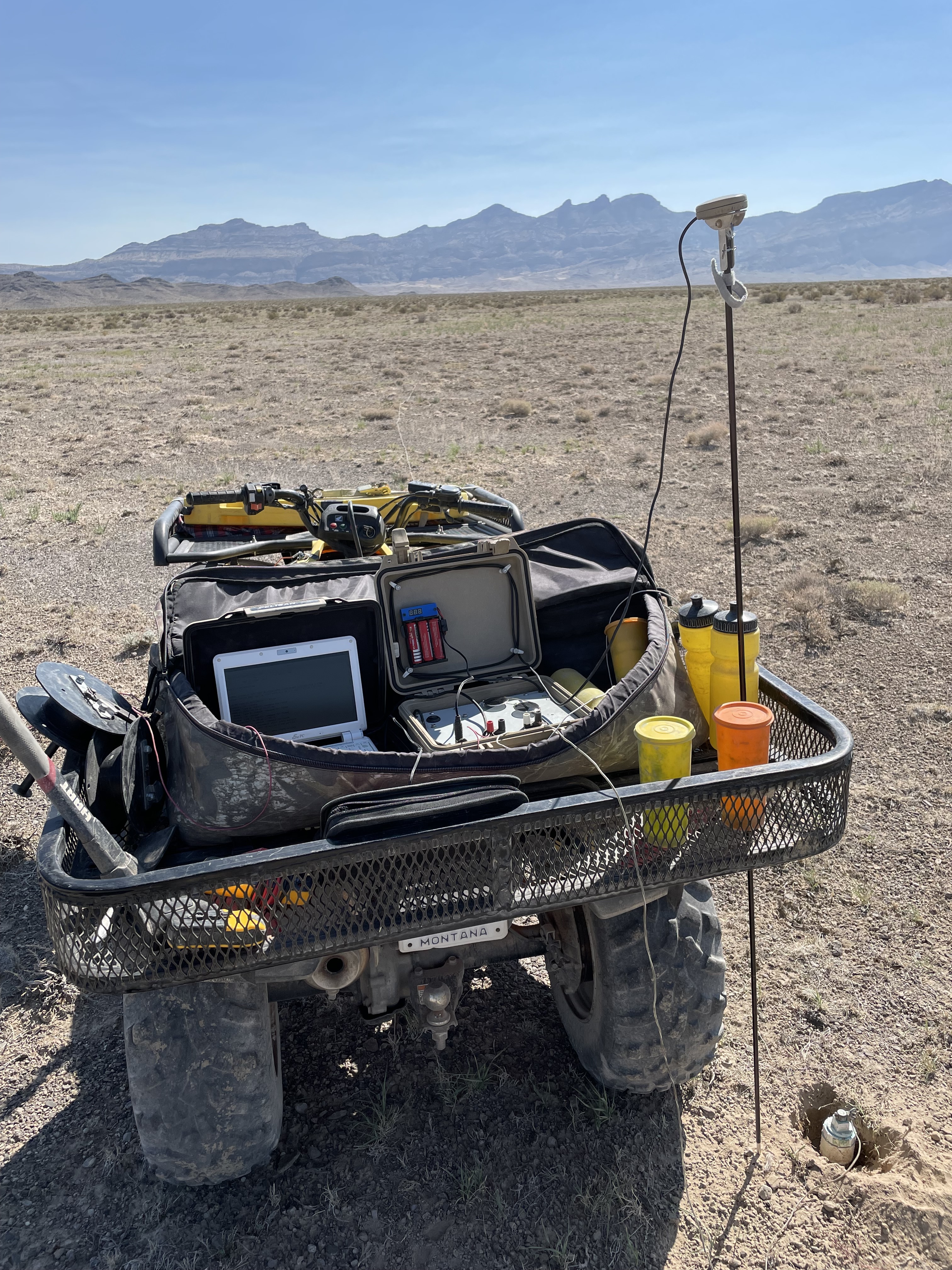 Natural source audio magnetotelluric (NSAMT) surveys. Where possible we use ATVs to deploy the telluric electrodes and leave the magnetic coils buried in one location.