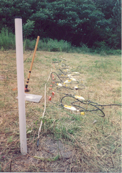 This picture shows the layout of geophones (on the ground) and hydophones (in the water filled borehole) for performing refraction seismic work. The sledgehammer and aluminum plate provide the acoustic source.