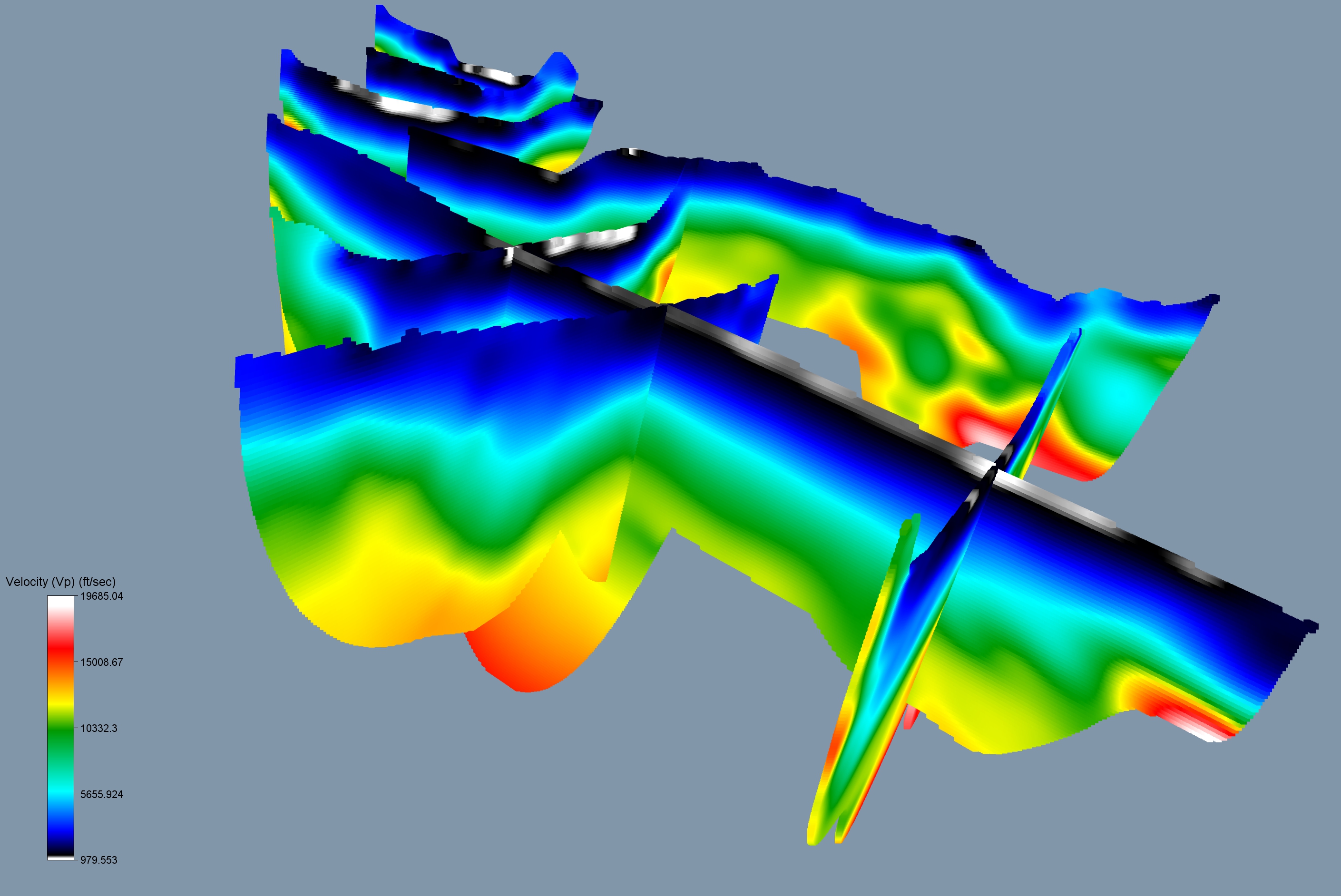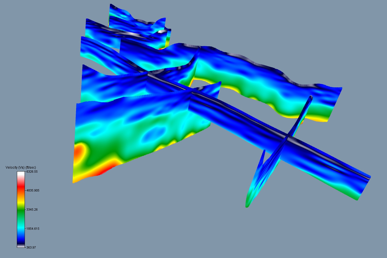 Figure 12: S-wave inversions viewed from the west using the same perspective as figure 11. Vertical exaggeration is 4x. Color scale has been enhanced to identify the lowest velocity zone (in gray/white). This zone is interpreted to be a possible paleochannel.