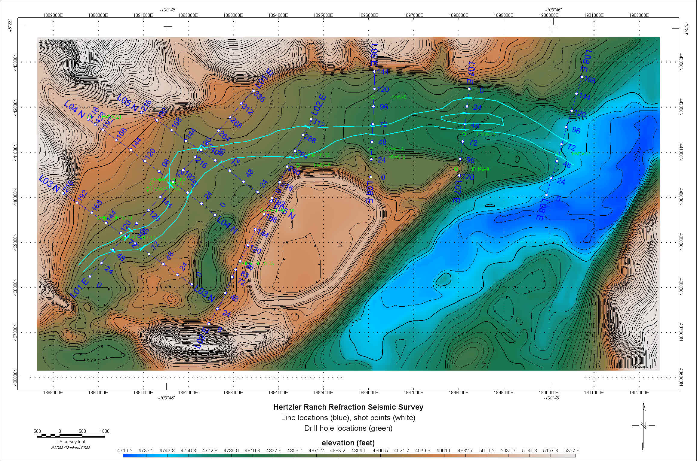 Figure 1: Line locations for the valley shown in blue. Shot point locations are indicated by white circles and drill holes with logs for comparison to the seismic sections are shown in green.
