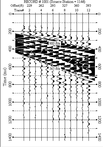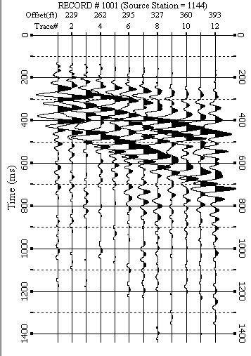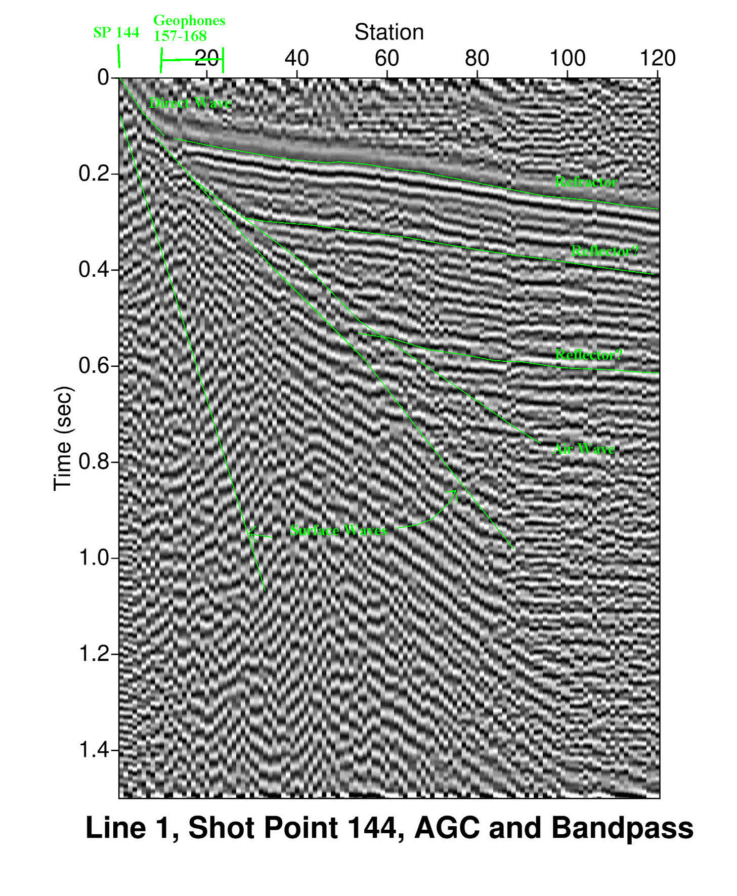 Figure 3: Shot point 144 on Line 1 which has had automatic gain control and bandpass filtering applied to emphasizes the response of reflectors and refractors. The seismic trace shows responses from the direct wave (P-wave that travels at the surface), rrefractor (P-wave) and possible aditional reflectors (P-wave). Also noted are the air wave (P-wave that travels through air, approxiate velocity of 340 m/sec or 1100 ft/sec) and the ground roll or surface wave (S-wave that travels at the surface). In general the S-wave velocity in any given rock is roughly 1/2 of the P-wave velocity.