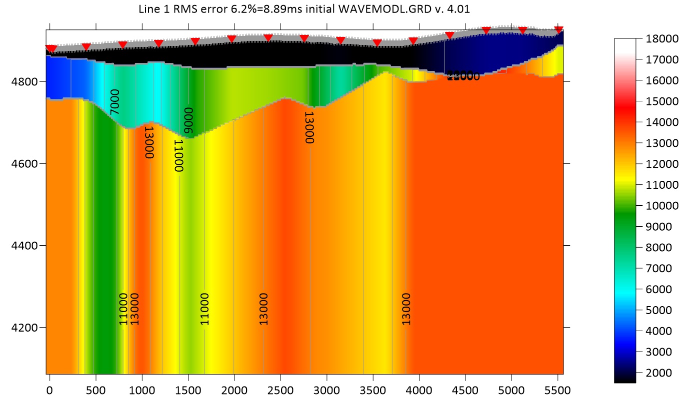 Figure 4 shows the refraction time picks for Line 1 in blue. For refraction processing only the travel time to the first interfaces are used. No amplitude information is used. wave velocity.