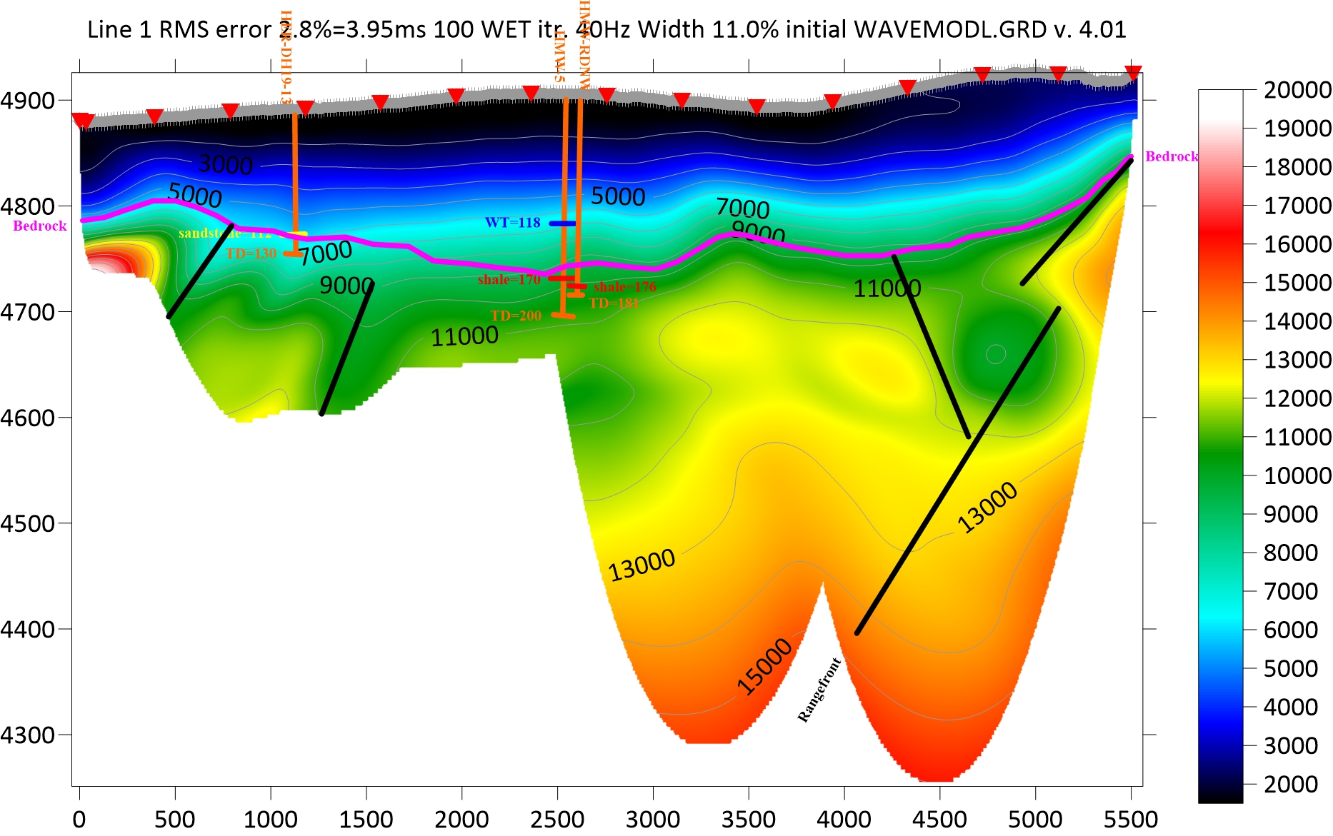 Figure 6: Line 1 P-wave inversion with interpreted faults (black), bedrock (magenta), and drillholes (orange). Lithology in the dirllholes for sandstone bedrock (yellow), shale bedrock (red), and water table (blue). All distances and elevations are in feet and all velocities are feet/sec.