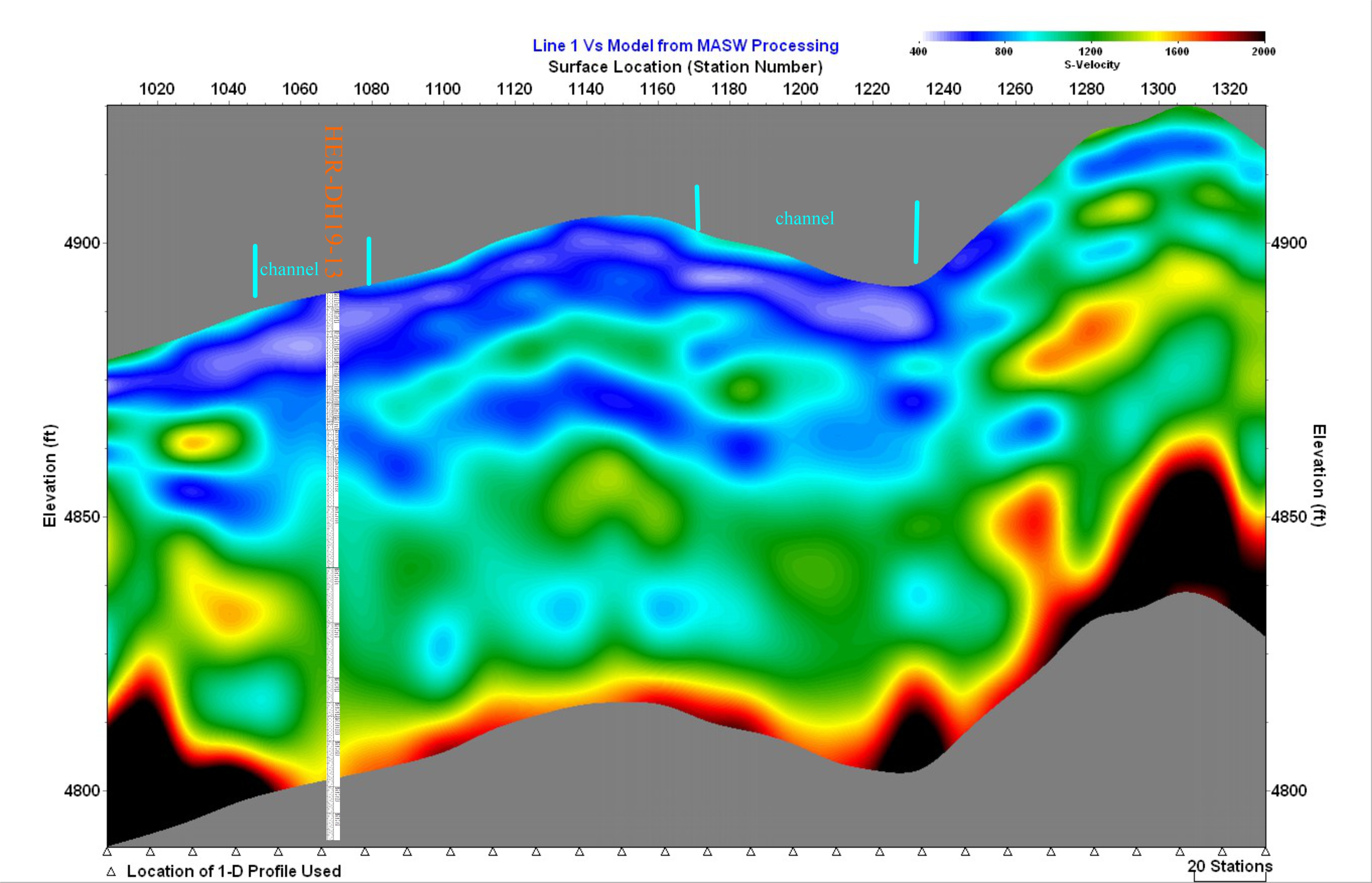 Figure 10: S-wave inversion for Line 1. The log for DH19-13 has been superimposed upon the section. Good stratagraphic layering is indicated in the image. Two possible paleochannels are marked based upon lower velocity values in the near surface data. All elevations and distances are in feet and all velocities are feet/sec.