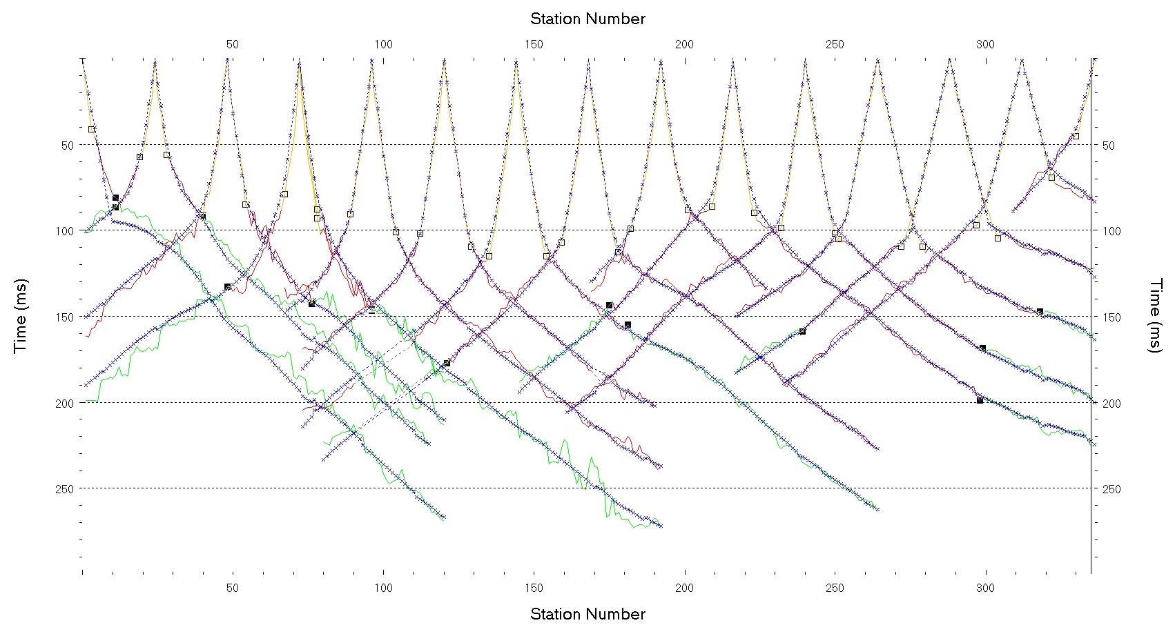 Figure 4: First break picks (in blue) for each of the shot points on Line 1. Squares mark picks for different layers. The inverted data are shown in orange (direct wave), red (first refractor), and green (second refractor).