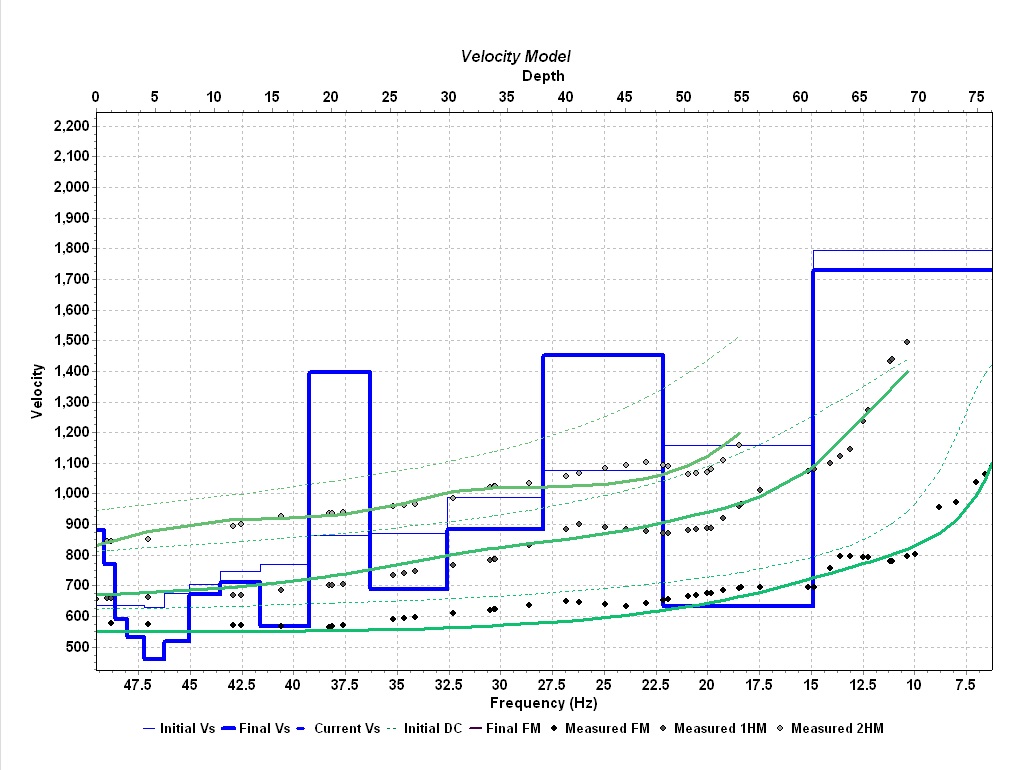 Figure 9: 1D inversion using 15 layers of the three modes picked from fig. 7 (black and gray dots). The initial frequency-velocity fit (dashed green lines), final frequency-velocity fit (solid green llines), initial velocity-depth model (thin blue line), and final velocity-depth model (thick blue line) are shown.