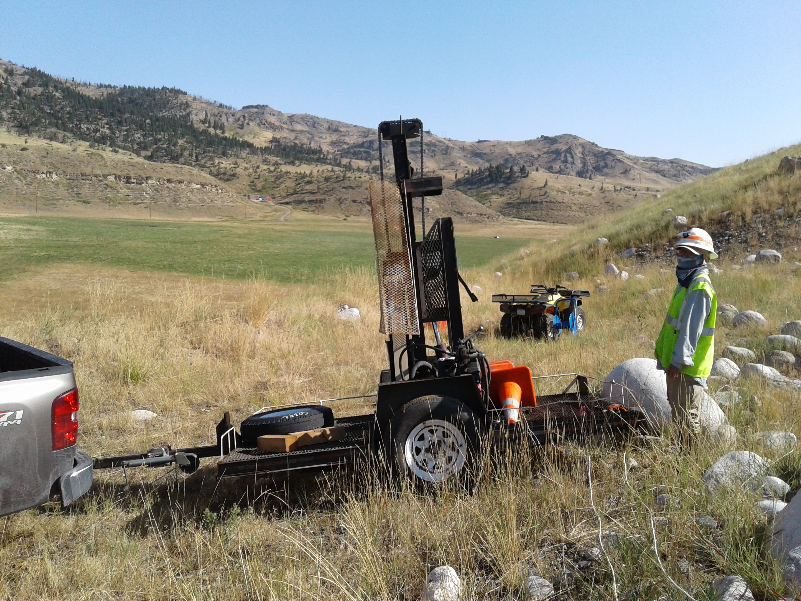 The receiver array consisted of 120 geophones separated by 5 meters. Shot points were taken at every 24th geophone. Data quality was generally good, but a different group was drilling for cone penetrometer measurements at the same time which introduced additional noise into the data. Most shots were taken using a 550 lb. weight drop mounted on a trailer. In more rugged terrain a 88 lb. weight drop was used, and finally at the ends of the lines in the hills a 16 lb. sledge hammer was used (Fig. 2).