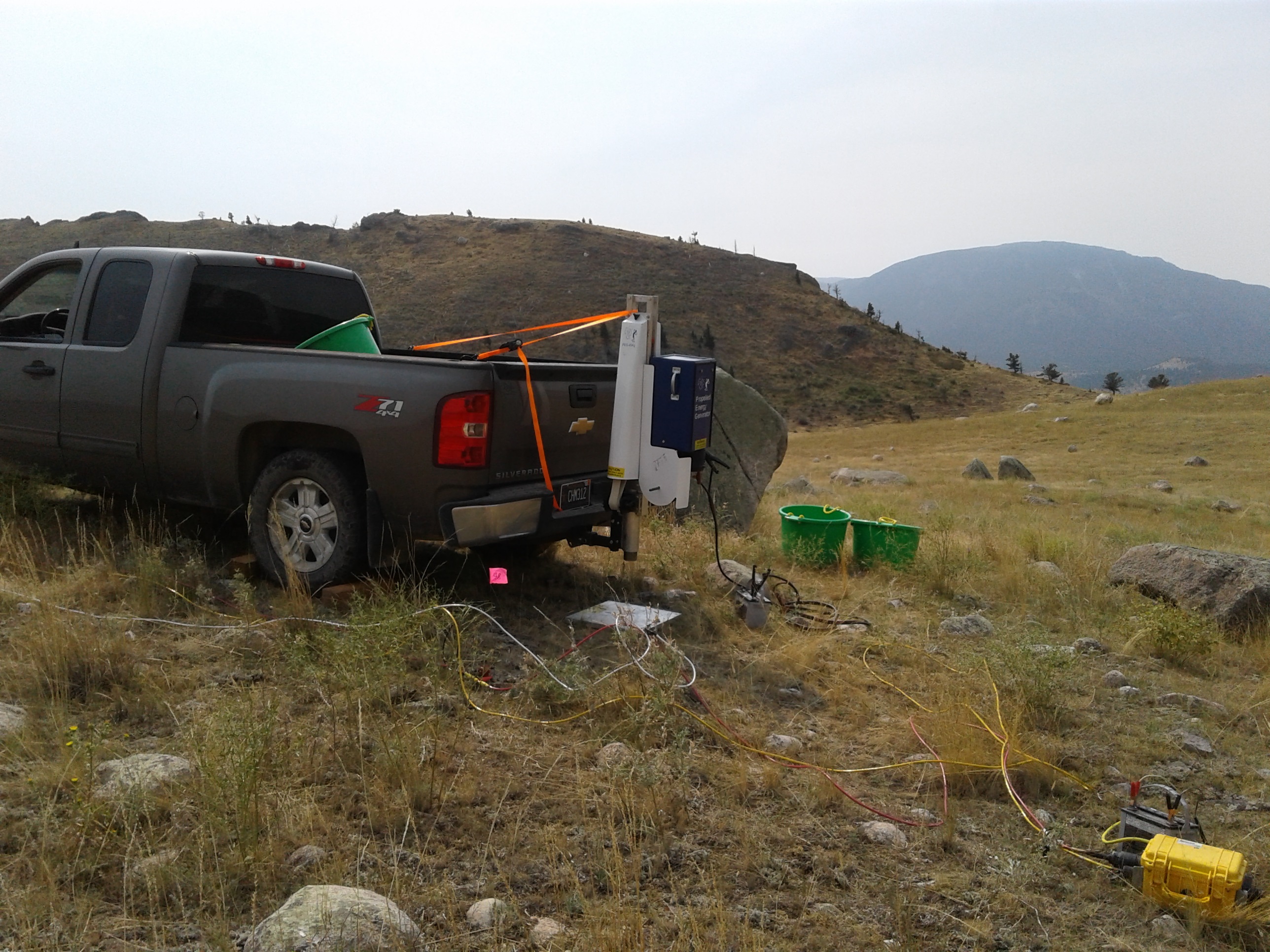 Figure 2: Trailer mounted 550 lb. weight drop and trailer hitch mounted 88 lb. weight drop. Both are accelerated by elastic bands. The yellow box in the second photo is one of the five seismographs used.
