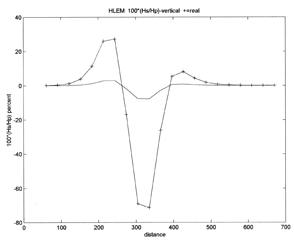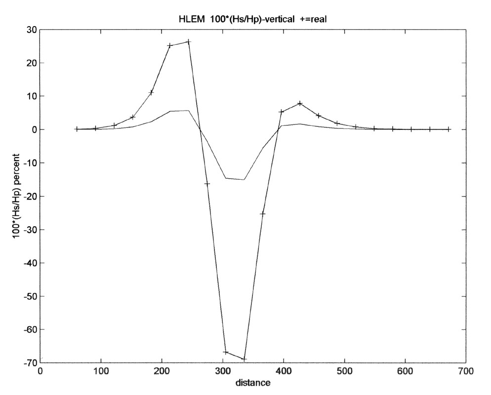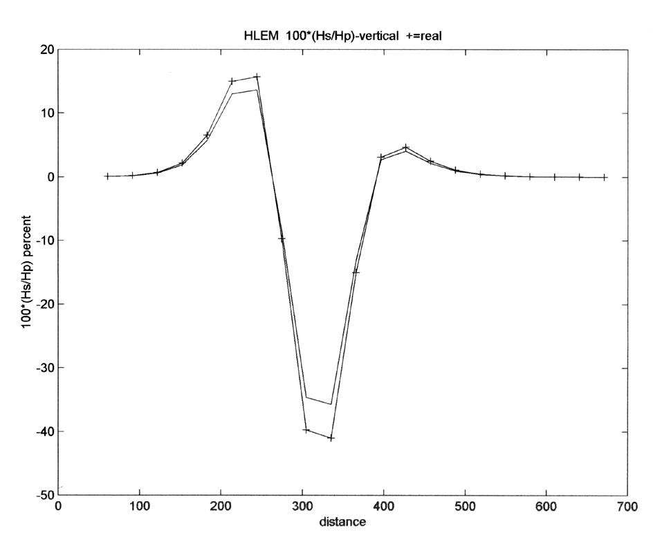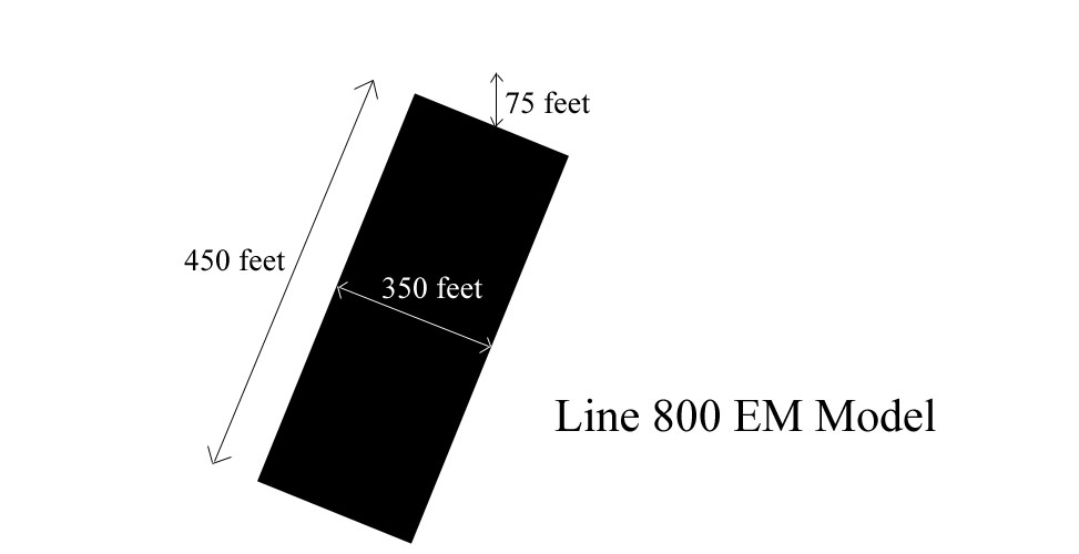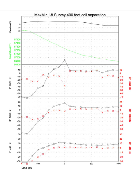 I used a very simple program for modeling the EM response on Line 800. EM conductors generate both inductive responses (strong conductors only) and current gathering responses (strong and weak conductors). The program I used can only model inductive responses so can only accurately approximate the responses of good, narrow, near vertical conductors. Wider and near horizontal conductors have a strong current gathering components to the total response. Fortunately, most sulfide bodies of interest are good, narrow, near vertical conductors. Figure 5 shows four panels with the three modeled frequencies and a cross section with the model body. The In Phase response is shown with a line with crosses and the Quadrature response is just a line. The model extends from 0 to 610 meters (2000 feet), with the conductor located at 305 meters (1000 feet).