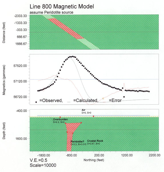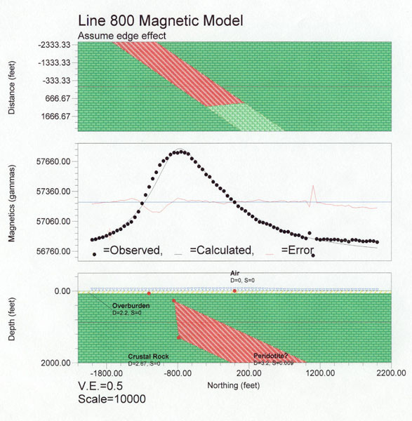 After reviewing the data, I attempted to model the magnetic response for Line 800 assuming the anomaly was caused by peridotite (Figure 3). The figure consists of three panels showing a plan view of the intrusive, the field and modeled magnetic data, and the modeled intrusive in cross section. The top panel is the plan view showing the strike direction of the intrusive relative to the profile line (red line). The aspect ratio of strike distance to profile distance is 4:1. The peridotite is in red and the granite is green. The middle panel shows the observed data (black dots), calculated response of the modeled bodies (black line), and model misfit (red line). The bottom panel shows the model cross section with each block labeled Air, Peridotite?, Crustal Rock, and Overburden. The red horizontal line shows the depth from which the plan view slice in the top panel was taken. The blue triangles show the observation station locations.